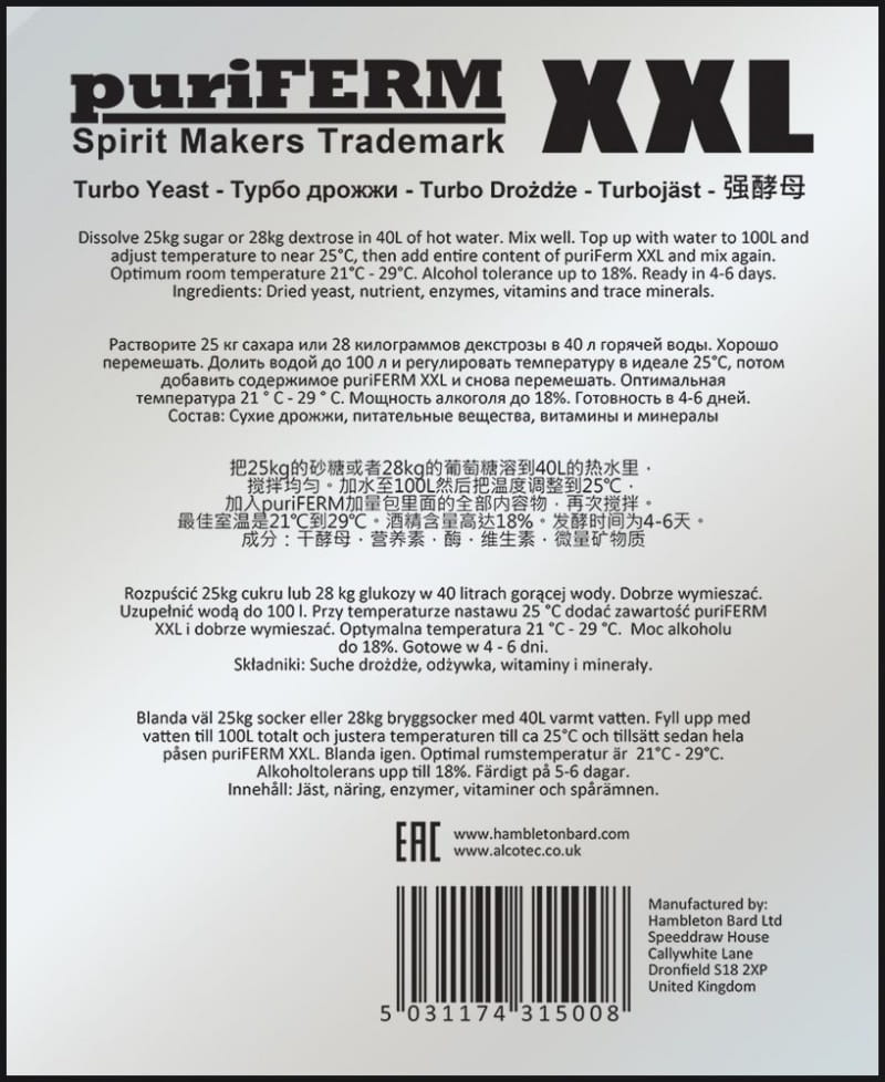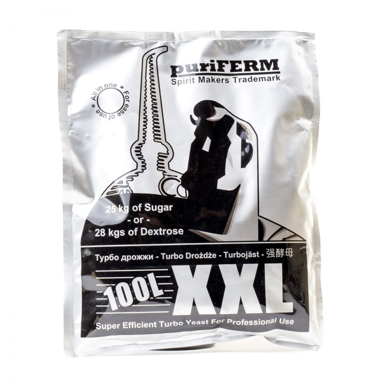 Puriferm XXL to zaawansowana mieszanka drożdży gorzelniczych stworzona specjalnie do fermentacji dużych nastawów (100 l), złożonych z 25 kg cukru lub 28 kg glukozy. Gwarantują ekspresową i potężną fermentację, osiągając aż 18% w zaledwie 4-6 dni. Te drożdże są niezwykle łatwe w użyciu, zapewniając jednocześnie profesjonalne efekty, porównywalne do komercyjnych gorzelni. Mieszanka dostarcza niezbędnych witamin i mikroelementów, wspierając drożdże przez cały okres fermentacji. Ze względu na dynamiczny przebieg reakcji, zaleca się niepełne zamykanie pojemnika i unikanie stosowania rurek fermentacyjnych oraz korków.