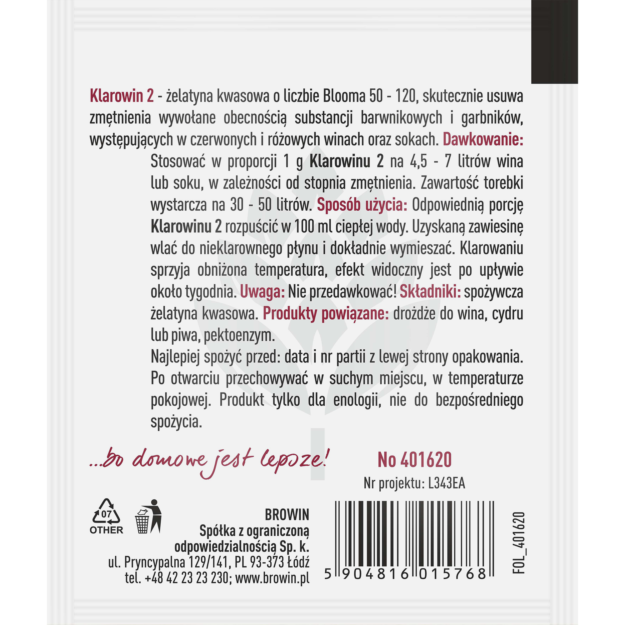 Uwagi: Jeśli zastosujesz większą niż zalecana dawkę środka klarującego, może wystąpić tzw. przeklarowanie. Płyn zamiast oczyścić się, z powrotem stanie się mętny. Dlatego przed użyciem preparatu przeprowadź próbę na małej porcji wina.