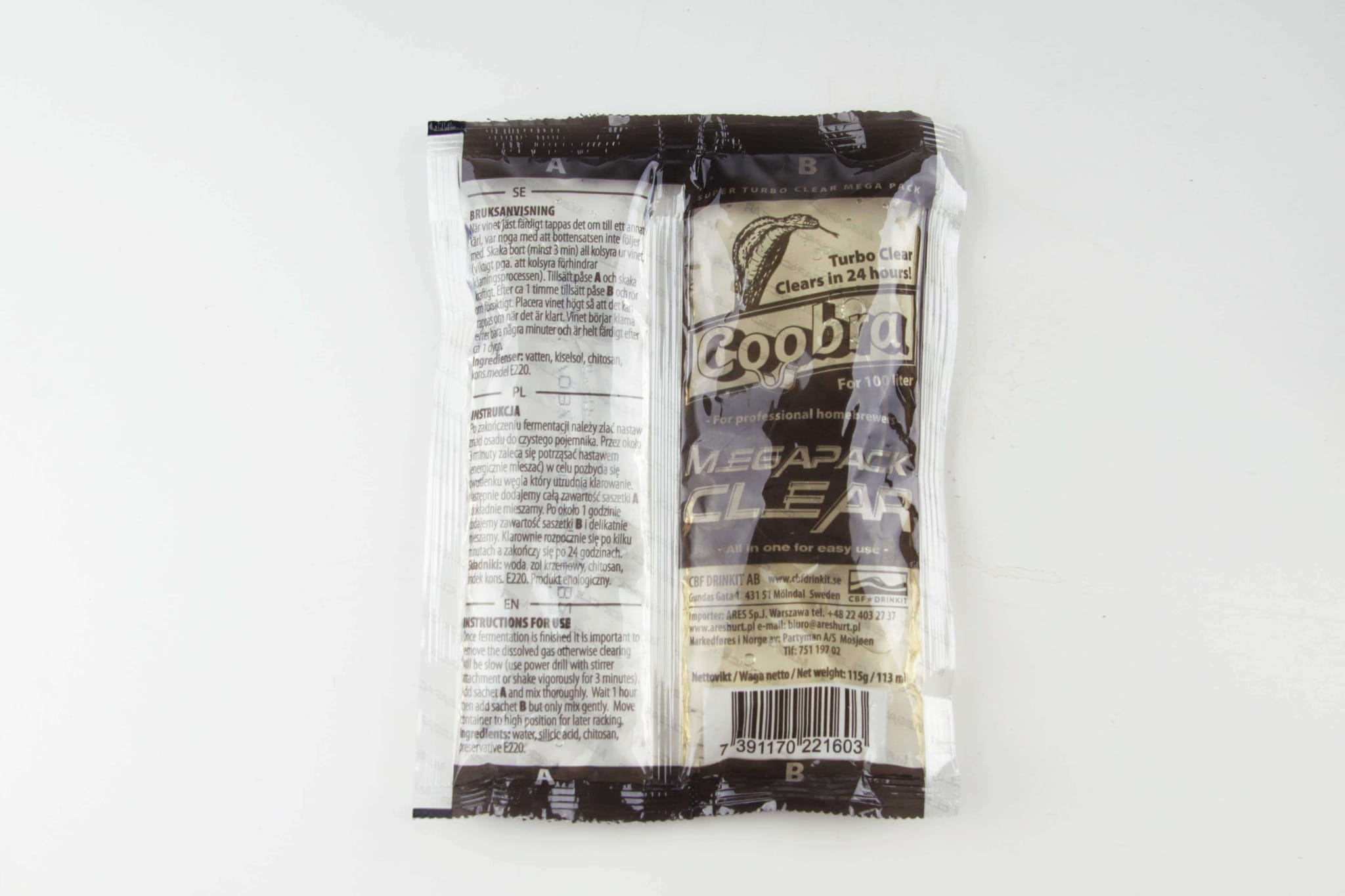 Coobra Megapack Clear to dwuskładnikowy, szybki i efektywny środek do klarowania. Aby osiągnąć doskonałą klarowność, po zakończonej fermentacji dodaj ten preparat do swojego nastawu. W pierwszym kroku przelej nastaw do czystego pojemnika, a następnie dokładnie zamieszaj, aby pozbyć się dwutlenku węgla. Dodaj saszetkę A i intensywnie wymieszaj. Po godzinie dolej saszetkę B i lekko zamieszaj. Proces klarowania nastawu zakończy się po 24 godzinach od dodania drugiej saszetki, co pozwoli uzyskać krystaliczną klarowność Twojego trunku.